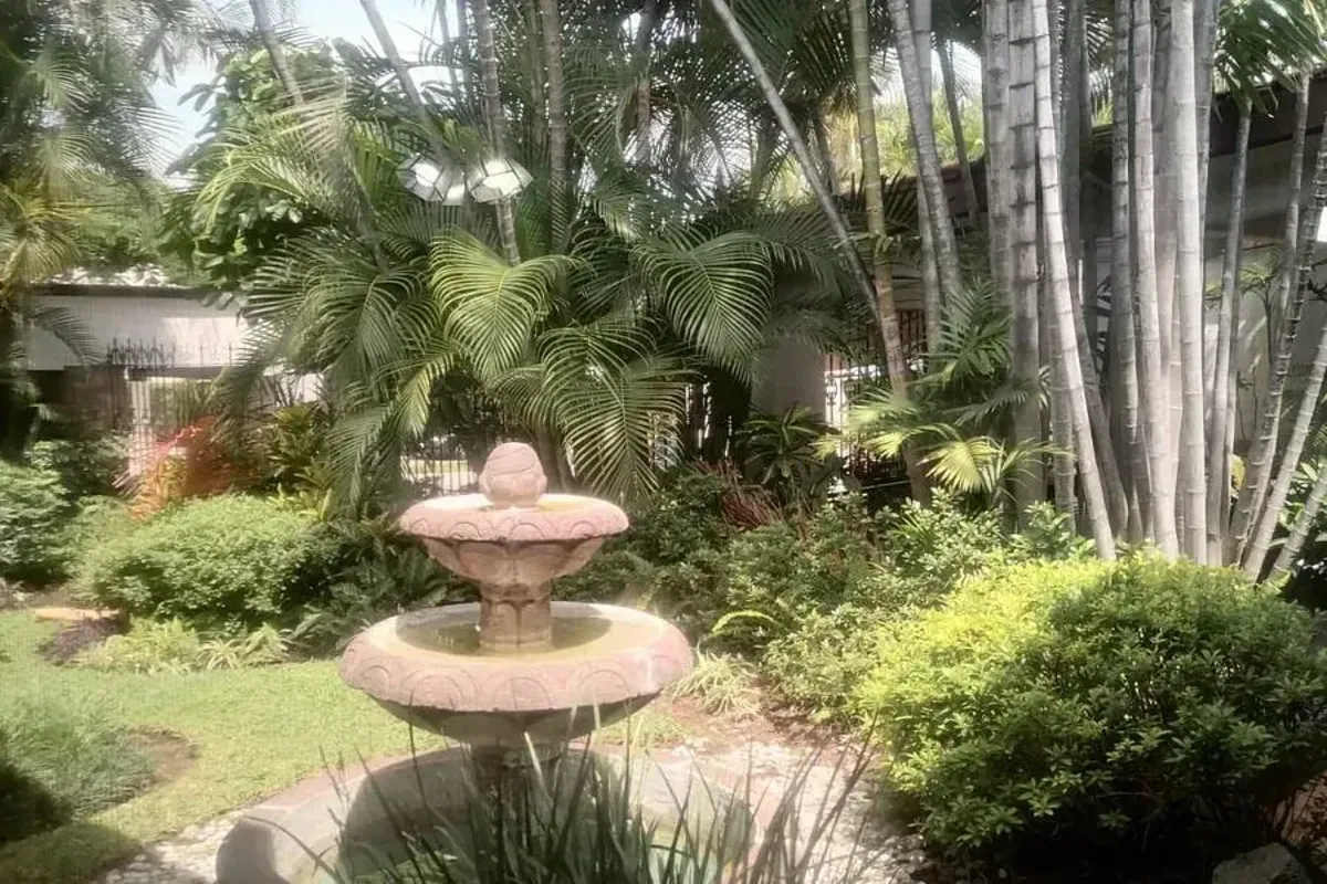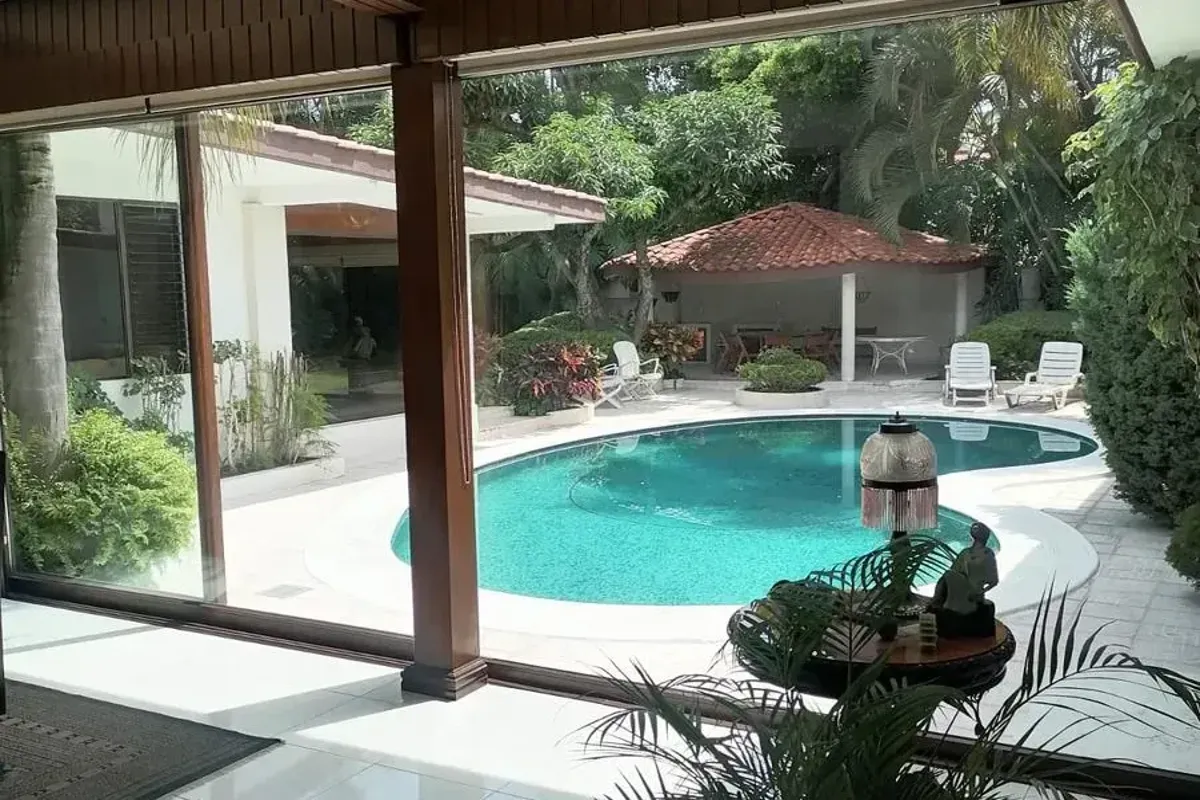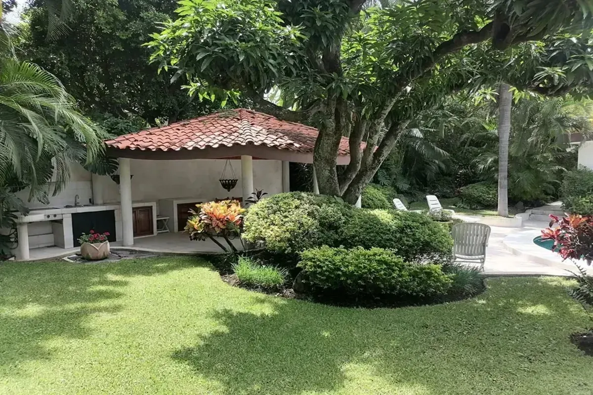 Exteriores: Alberca y palapa rodeadas de un hermoso jard铆n arbolado y con mucha